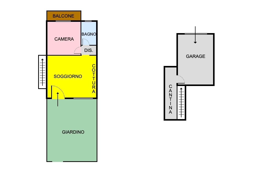 Una scala in muratura accompagna al piano inferiore, adibito ai servizi, organizzato in cantina e garage di 20 mq.