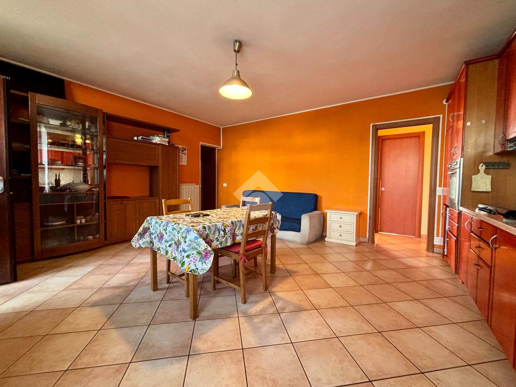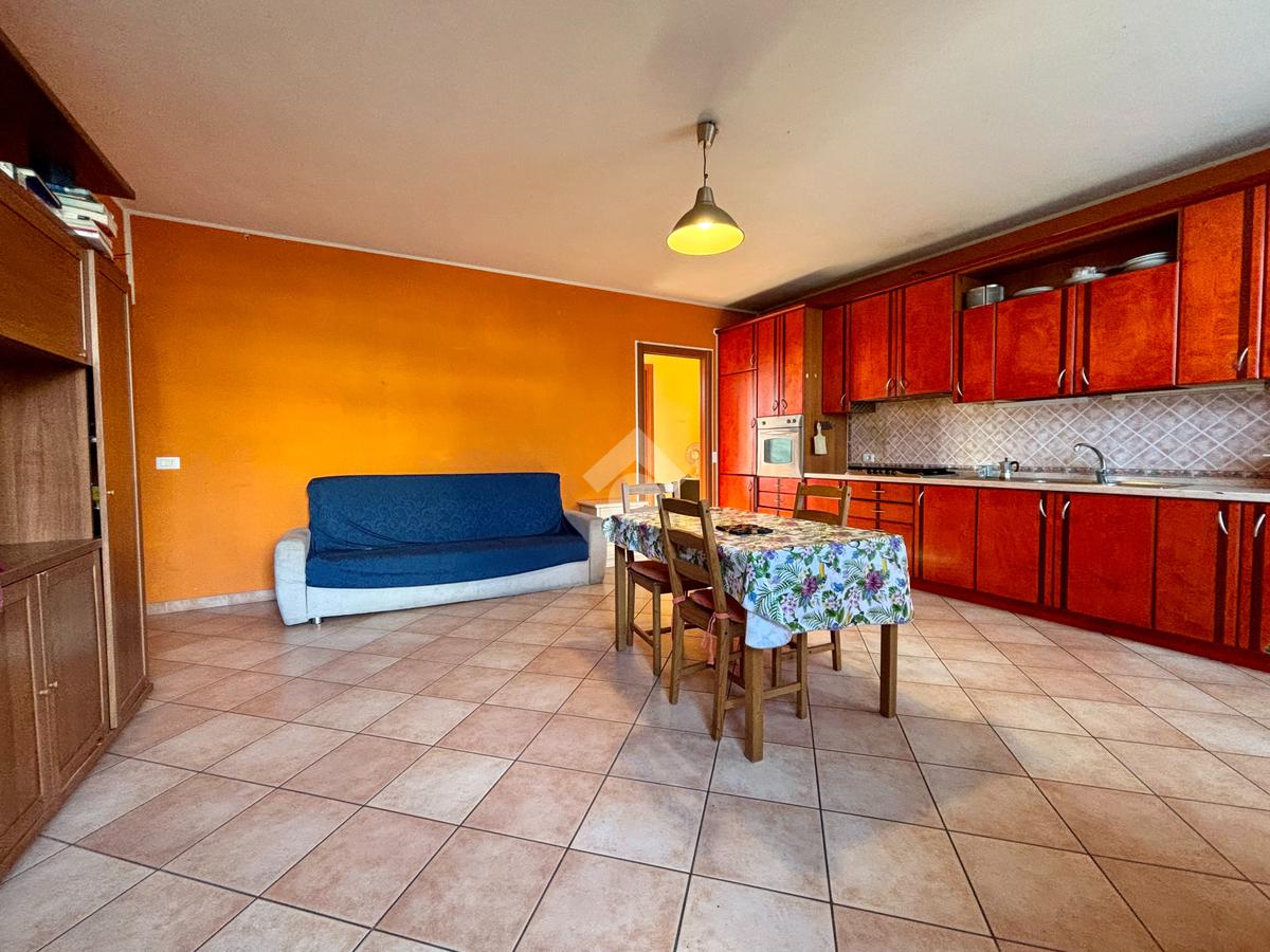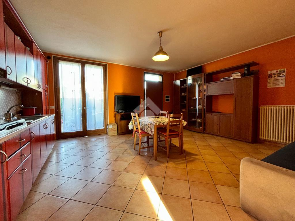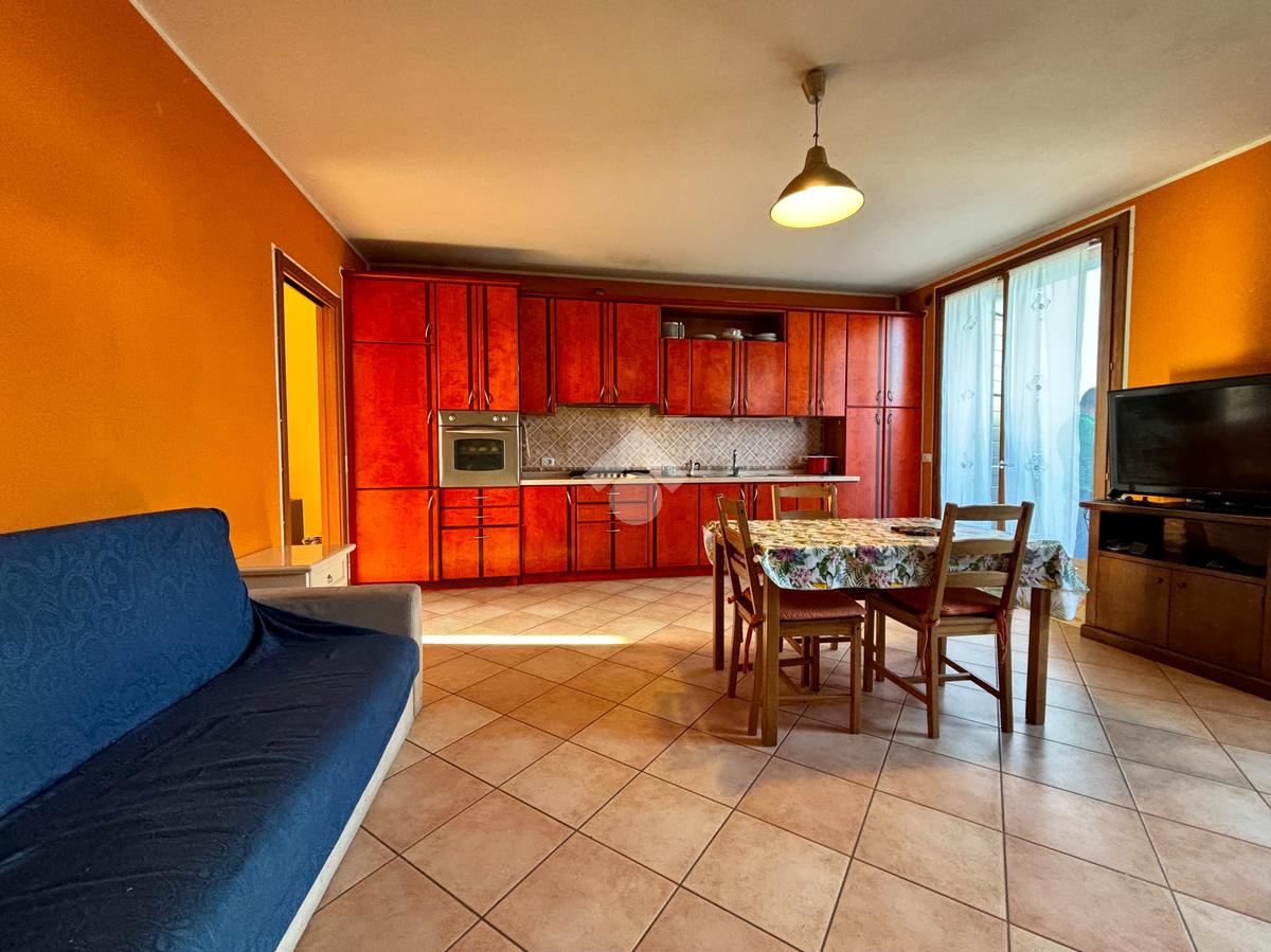 Entrando, si è accolti da una spaziosa zona giorno, calda ed accogliente, dotata di angolo cottura a vista e un'ampia porta finestra che le dona luce naturale.