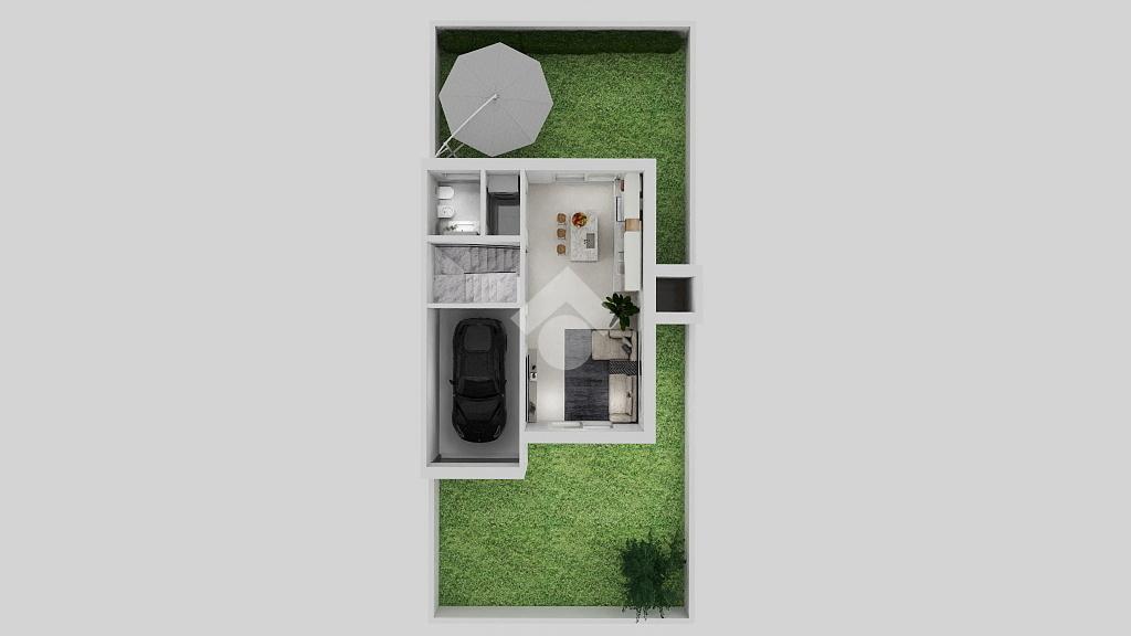 Un ingresso privato consente di raggiungere, tramite un giardino 103 mq, il piano terra dove è possibile trovare un ampio soggiorno - pranzo di circa 35 mq, un bagno finestrato con antibagno ed un garage di 20 mq.