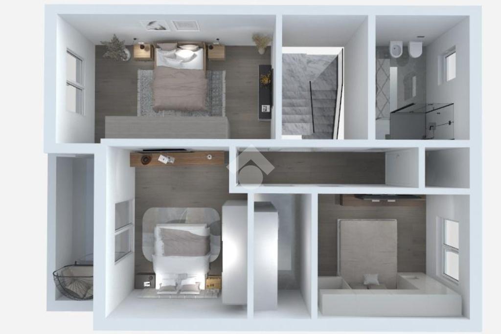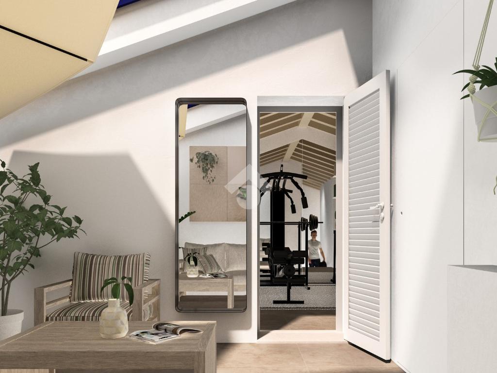 Infine, la scala accompagna anche all'ultimo piano, mansardato, che raggiunge una metratura di circa 45 mq e consente l'accesso ad un terrazzo solarium che dona all'abitazione uno sfogo esterno gradevole e riservato ed una splendida vista panoramica.